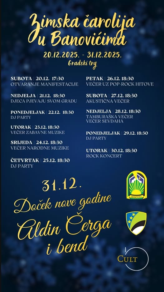 Banovići će krajem decembra zablistati u posebnom zimskom ruhu uz manifestaciju „Zimska čarolija“. U periodu od 20. do 31. decembra, svake večeri posjetioce očekuje bogat i raznolik program ispunjen muzikom, zabavom i prazničnim raspoloženjem.