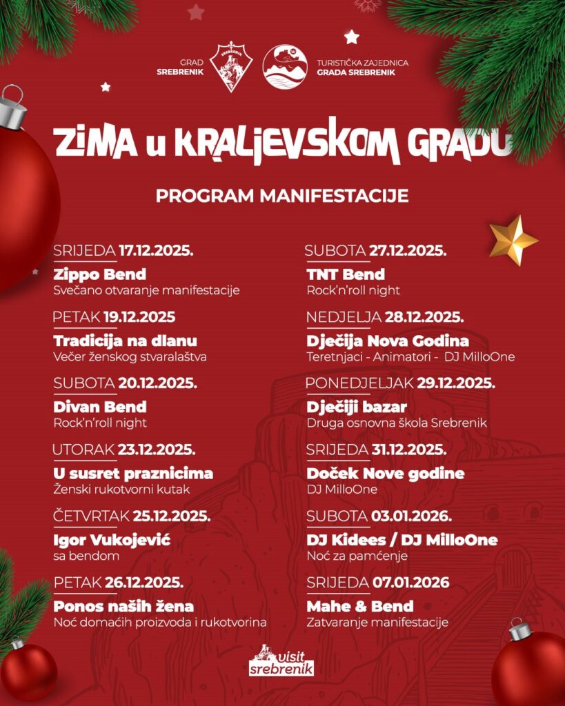 Grad Srebrenik i Turistička zajednica Grada Srebrenika i ove godine nastavljaju s tradicijom da svim sugrađanima i gostima pruže nezaboravno zimsko iskustvo ispunjeno toplinom, muzikom i raznim sadržajima. U srcu Srebrenika se rađa magična zimska priča, koja će već od 13. decembra dočekati sve željne druženja i radosti sa čarobnim kućicama.