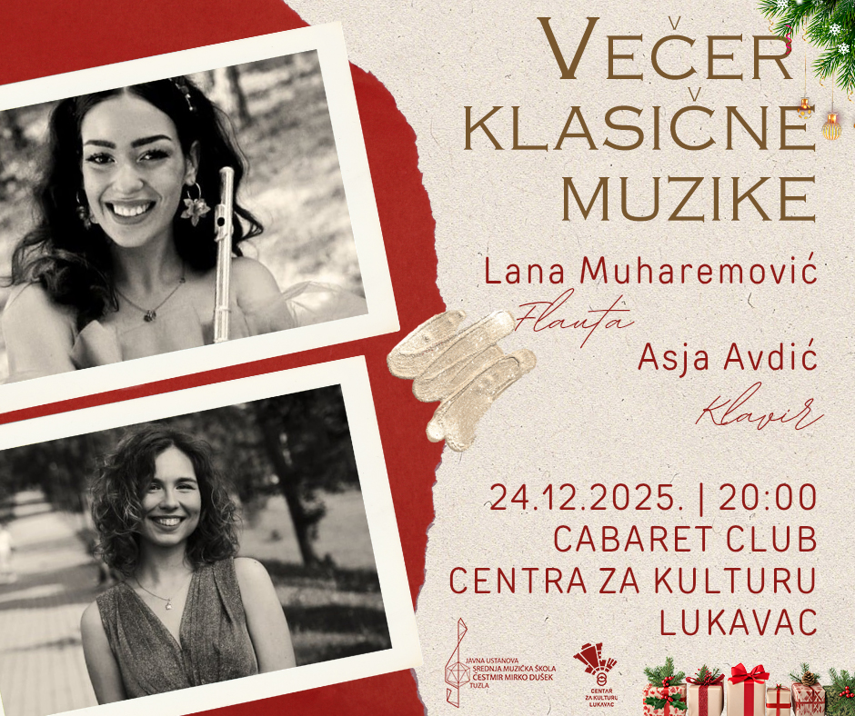 U srijedu, 24. decembra 2025. godine, s početkom u 20:00 sati, prostor Cabaret Cluba bit će mjesto susreta s vrhunskom umjetnošću kroz koncert klasične muzike u izvođenju dvije mlade, ali već zapažene talentovane umjetnice.